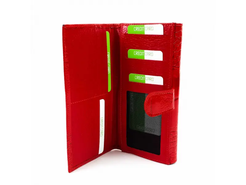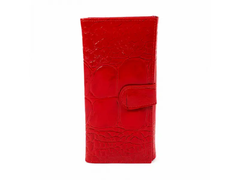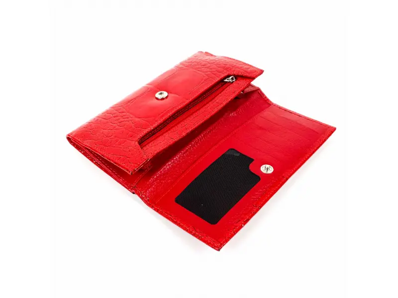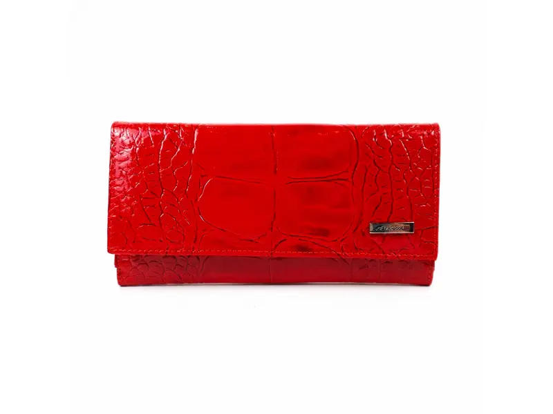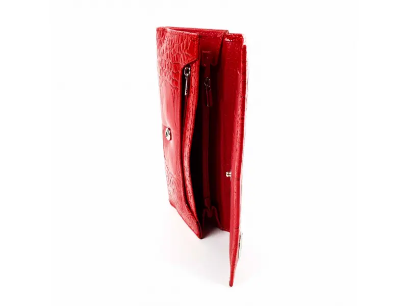 Качествено дамско портмоне от телешка, естествена кожа и лак. Червено портмоне с удобно разпределение за банкноти, отделение за монети затварящо се с цип. Много слотове за банкови и визитни карти, лични документи в задната част на портмонето.