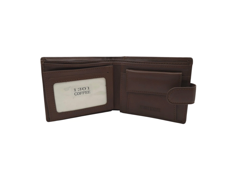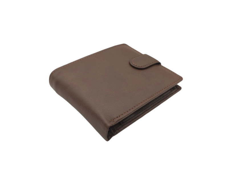 Мъжки портфейл от качествена ествествена кожа на ниска цена. Кафяв мъжки портфейл със закопчалка с удобно разпределение за банкноти, монети и лични документи.