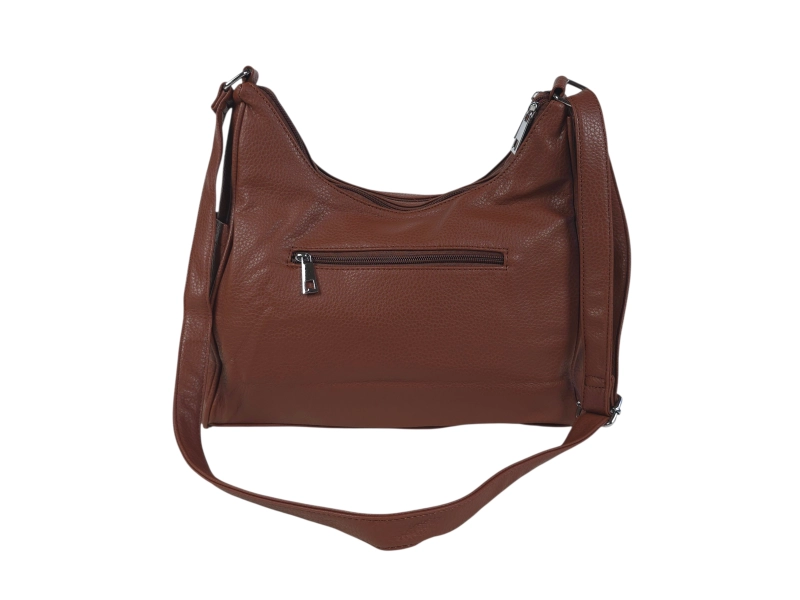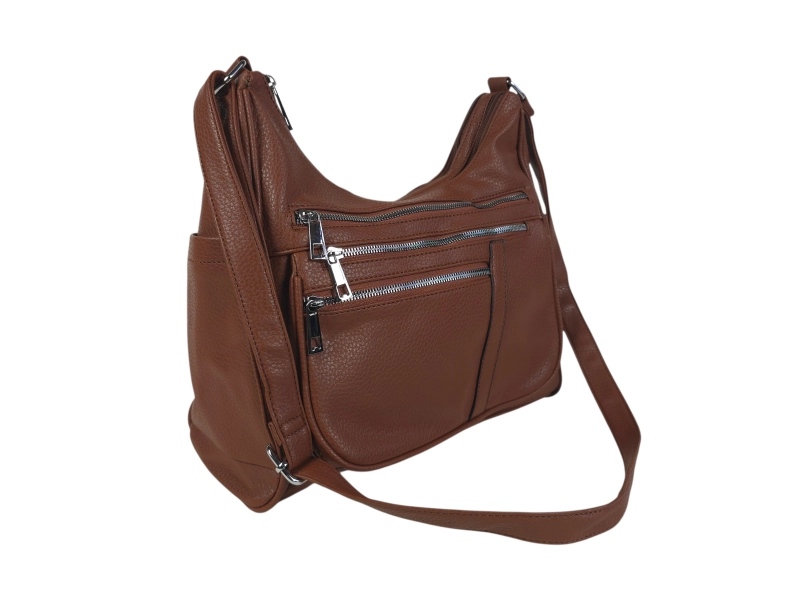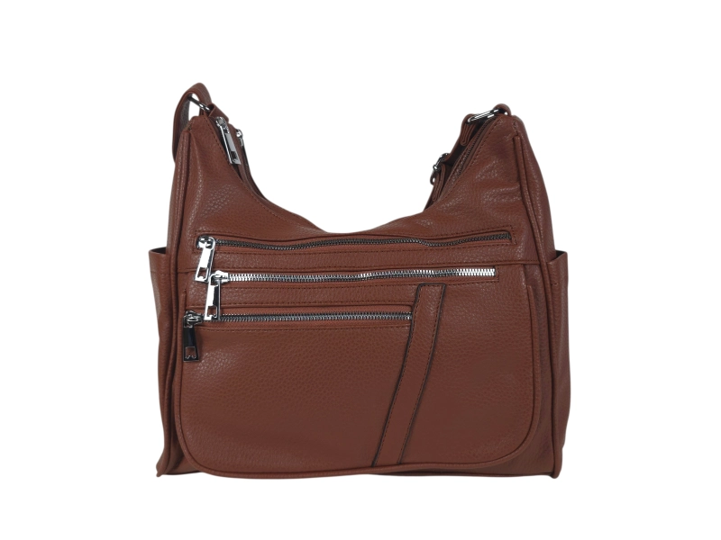 Кафява дамска чанта от качествена еко кожа. Дамска чанта с много отделения и регулираща се дълга дръжка. Ежедневна дамска чанта с интересен дизаин.