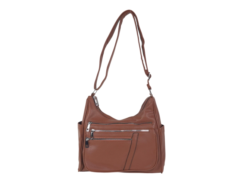 Дамска чанта с удобна презрамка - Дамска чанта от еко кожа. - Две основни отделения с цип - Малък вътрешен джоб с цип. - Три предни джоба с цип. - Заден джоб с цип. - Два странични джоба. - Дълга регулираща се дръжка.
