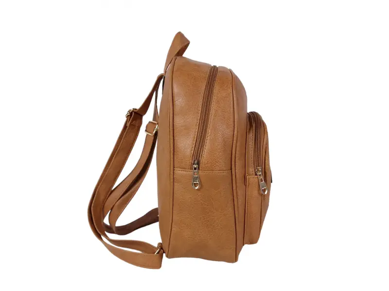 Удобна дамска раница в кафяв цвят - Дамска раница от еко кожа. - Едно голямо отделение с цип. - Вътрешен джоб с цип. - Отделение за телефон или ключове. - Три предни джоба затварящи се с цип. - Дръжка за носене в ръка. - Регулиращи се презрамки.