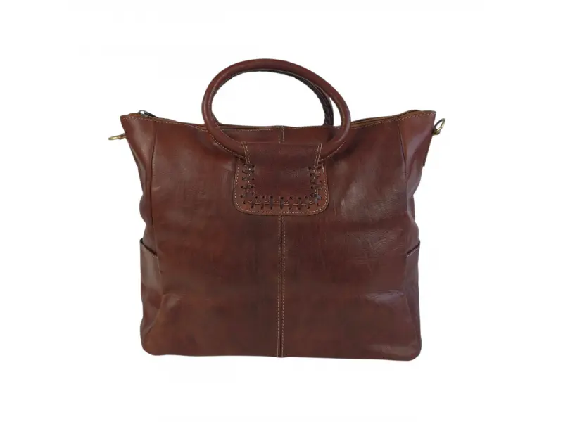 Голяма дамска чанта - Дамска чанта от естествена кожа. - Едно основно отделение с цип. - Малък вътрешен джоб с цип. - Два странични джоба. - Удобни дръжки. - Дълга дръжка.