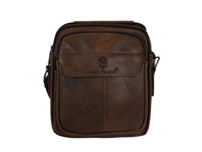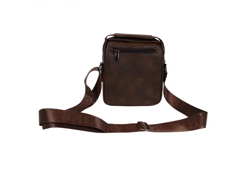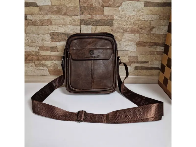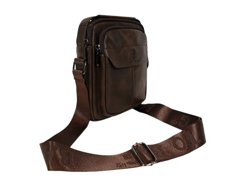 Мъжка чанта от качествена еко кожа в кафяв цвят. Удобна чанта с едно основно отделение с цип, малко вътрешно джобче с цип, заден джоб с цип и два предни джоба с цип. Здрава мъжка чанта с удобна дръжка за носене в ръка и регулираща се презрамка.