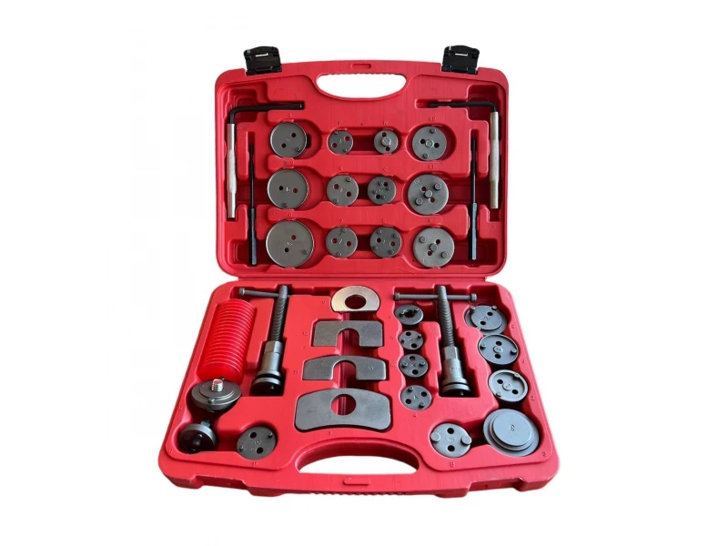 Комплектът инструменти за смяна на накладки от 35 части е създаден за професионалисти и любители, които търсят удобство и ефективност при подмяната на спирачни накладки.