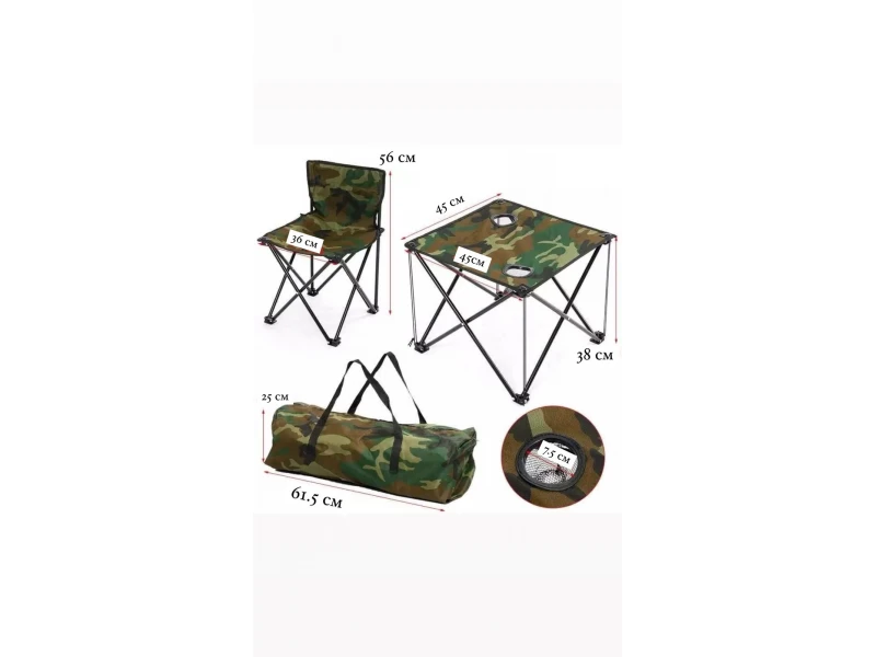 Този комплект къмпинг е идеален за любителите на открито и приключения. Състои се от сгъваема маса с камуфлажен дизайн и четири удобни стола, които се сгъват за лесно съхранение и пренасяне. Може да се използва при къмпинг, пикници, риболов, барбекюта или всякакви други дейности на открито.Характеристики:Сгъваема маса с камуфлажен мотив, стабилна и устойчива на външни условия.Четири стола, всеки с ергономичен дизайн и здрави метални рамки.Лесна за носене транспортна чанта, която осигурява удобно съхранение и пренос на комплекта.Компактни размери, които осигуряват лесно съхранение и пренасяне.Идеален за къмпинг, пикници, риболов, барбекюта и други outdoor активности.Предимства:Практичен и лесен за употреба.Здрав и издръжлив материал, подходящ за всякакви климатични условия.Камуфлажен дизайн, който съчетава функционалност и стил в природата.Лесно сгъваем и компактен, за да може да го вземете навсякъде.Този комплект ще направи всяко ваше излизане на открито още по-удобно и приятно!