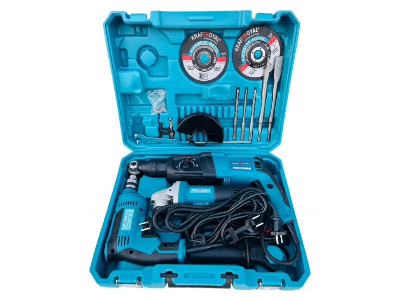 Комплект от перфоратор, ъглошлайф 125 мм и бормашина 1200W KraftRoyalКомплектът електроинструменти Kraftroyal е универсален и ефективен комплект, който ще ви помогне с различни работни проекти. Всеки инструмент се захранва от 220 V мрежа, което ви дава мощността, от която се нуждаете, за да завършите задачите.Пакетът включва и редица полезни аксесоари като гъвкави дискове за рязане на метал, спирали (свредла) за пробиване в зидария, длета (плоски и заострени), дистанционер, патронник и гаечни ключове. Включена е и кутия за съхранение, за да поддържате вашите инструменти организирани и защитени.ХАРАКТЕРИСТИКИ НА ЪГЛОШЛАЙФ:Мощност: 1200WНоминално напрежение: 220VНоминална честота: 50HzОбороти на празен ход : 11000 об/мин 1Вътрешен диаметър на диска: 22-23ммМаксимален външен диаметър на диска: 115ммМаксимална дебелина на шлифовъчния диск: 6ммДължина на резбата на вретеното: 14ммИдеален е за рязане, шлифоване и полиране на различни повърхности.Ергономичният гумиран дизайн на дръжката ви осигурява комфорт и контрол при използване.ХАРАКТЕРИСТИКИ НА ПЕРФОРАТОР:Мощност 1200 WЕнергия на удара 0 – 3 JЧестота на ударите при номинални обороти 0 – 4.000 /минНоминални обороти 0 – 900 /минЗахват на инструмента SDS-plus с вградена защита срещу прахДиаметър на отвора в бетон със свредло за перфоратори 4 – 26 ммОптимална област на приложение в бетон със свредло за перфоратори 8 – 16 ммМаксимален диаметър на отвора в зидария с корона за ядково пробиване 68 ммМаксимален диаметър на пробиване в стомана 13 ммМаксимален диаметър на отвора в дърво 30 ммБезстепенно регулиране на оборотите – Дясно/ляво въртене3 режима на работа – пробиване , ударно пробиване , къртенеСъс слаби вибрации при работа и празен ходЛеко притискане, за работа без умораВградена защита срещу прахСферична връзка на кабелаПроменливо фиксиране на секача в 12 положения под различен ъгълРъкохватка с покритиеМеко противоплъзгащо покритие на главната и допълнителната ръкохватка за сигурно хващане