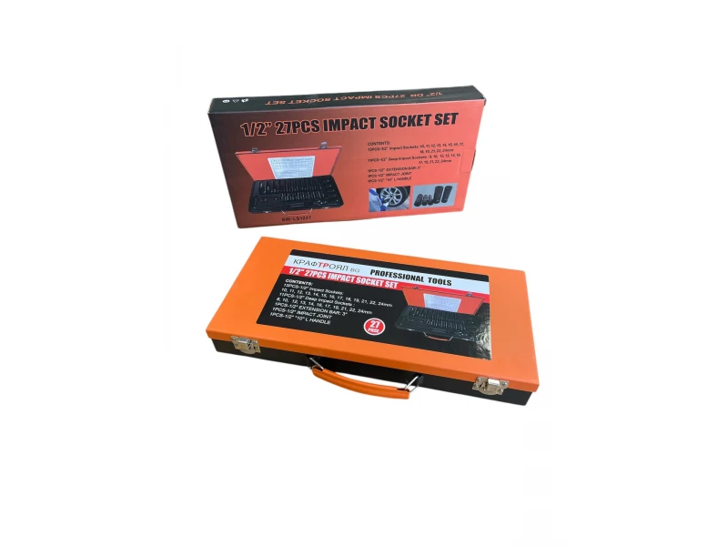 Този комплект ударни вложки KRAFTROYAL е идеален за професионални механика и любители на домашните ремонти. Състои се от 27 части, включително къси и дълги вложки за широк диапазон от приложения, а също така предлага удължител и ударен кардан за по-голяма гъвкавост.Основни характеристики:✔ Марка: KRAFTROYAL – лидер в производството на висококачествени инструменти. ✔ Размер на захвата: 1/2” – подходящ за професионални ударни гайковерти и други инструменти. ✔ Общо брой части: 27 ✔ Тип вложки: Ударни, подходящи за високи натоварвания и работа с пневматични или електрически инструменти.Съдържание на комплекта:Къси вложки: 10 мм, 11 мм, 12 мм, 13 мм, 14 мм, 15 мм, 16 мм, 17 мм, 18 мм, 19 мм, 21 мм, 22 мм, 24 ммДълги вложки: 9 мм, 10 мм, 12 мм, 13 мм, 14 мм, 16 мм, 17 мм, 19 мм, 21 мм, 22 мм, 24 ммУдължител: 1 брой – за по-голям достъп до труднодостъпни места.Върток: 1 брой – за прецизно въртене и лесно управление.Ударен кардан: 1 брой – осигурява удобство при работа в ограничени пространства.Предимства:✔ Универсалност: Вложките покриват широк диапазон от размери и са подходящи за множество приложения. ✔ Изключителна здравина: Ударните вложки са проектирани да издържат на високи натоварвания и да осигуряват надеждност дори в тежки условия. ✔ Практичност: Комплектът включва удължител и ударен кардан, които позволяват работа на труднодостъпни места и предлагат допълнителна гъвкавост.Перфектен комплект за механика, ремонт на автомобили, строителни проекти и всякакви задачи, изискващи ударни вложки.