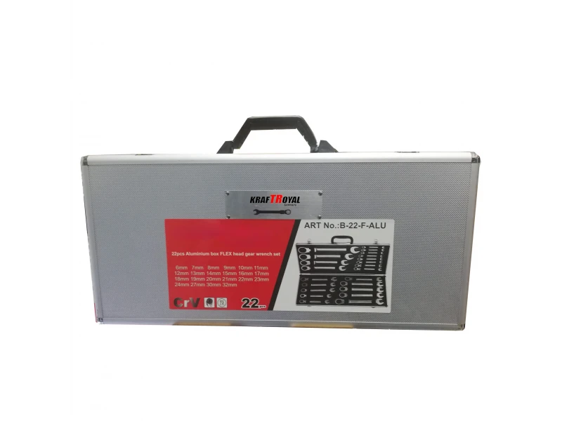 Комплект звездогаечнитресчотни ключове от 6 мм до 32 мм в метален куфар KraftRoyal пълен комплект 6 до 32 мм (22 части) – 8 мм, 9 мм, 10 мм, 11 мм, 12 мм, 13 мм, 14 мм, 15 мм, 16 мм, 17 мм, 18 мм, 19 мм, 20 мм, 21мм, 22 мм, 23 мм, 24 мм, 27 мм, 30 мм, 32 ммтресчотка – 72 зъба с право рамо