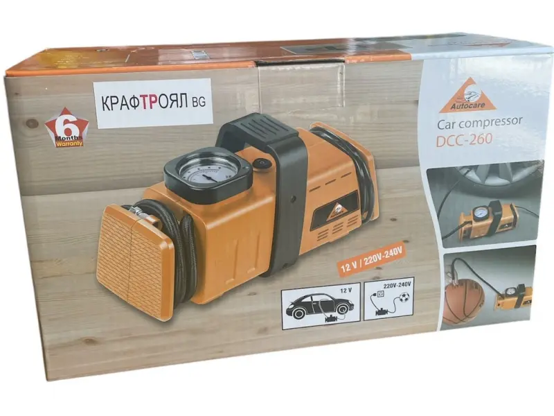 Открийте удобството с компресора за гуми KraftRoyal 7 Bar! 🚗 Компактен и лесен за пренасяне, той е идеален за автомобили, бусове, джипове, скутери и велосипеди. С включени накрайници за надуваеми дюшеци и топки, ще бъдете готови за всяко приключение. Антивибрационните крачета осигуряват стабилност при работа. Захранвайте го удобно от автомобилната запалка или електрическата мрежа. Не чакайте, осигурете си спокойствие на пътя днес!