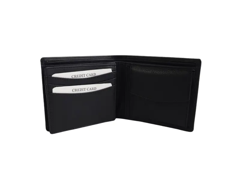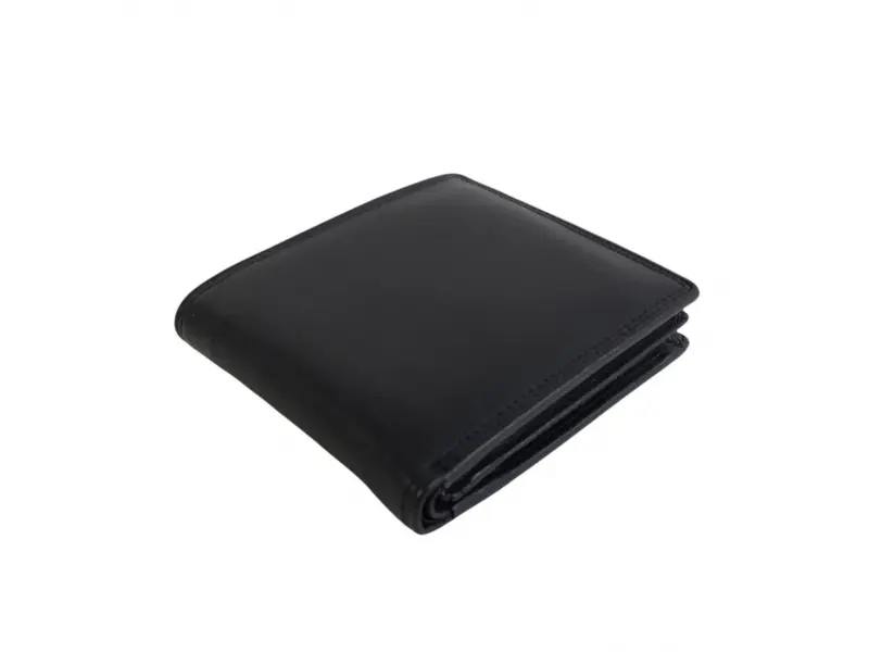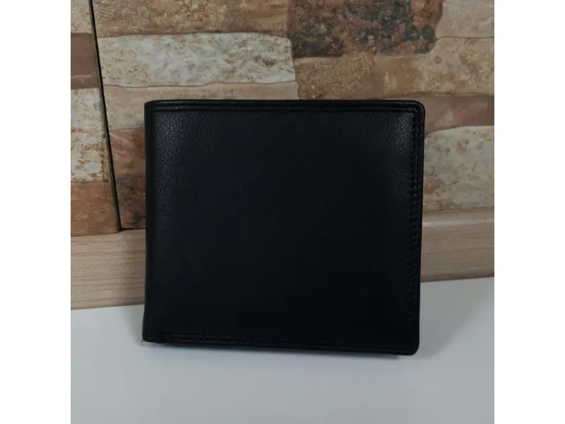 Удобен мъжки портфейл от естествена кожа в черен цвят. Качествен портфейл с преграда за банкноти, слотове за карти и документи и вътрешен монетник.