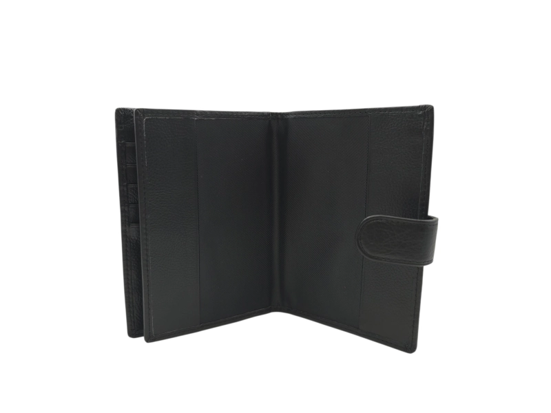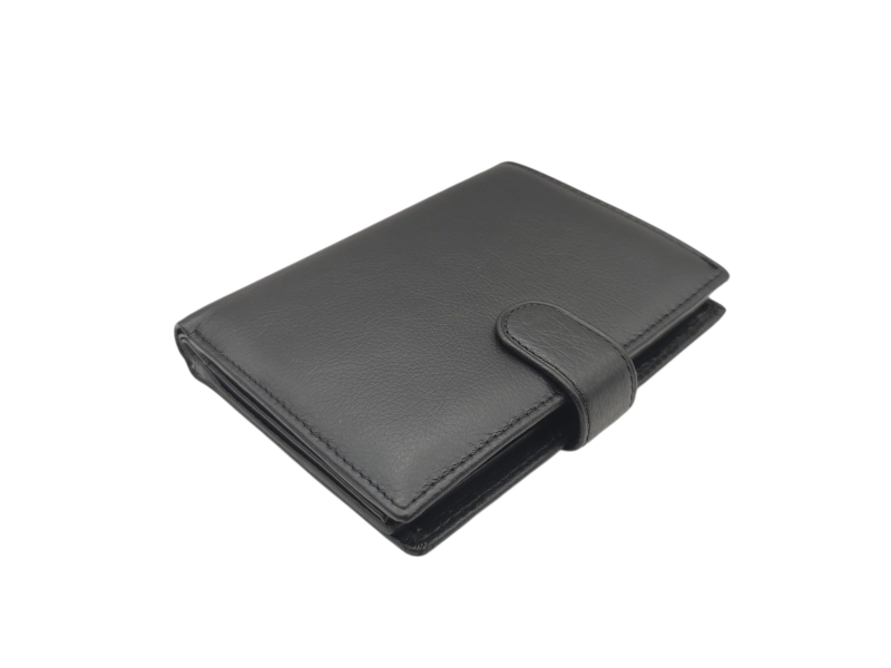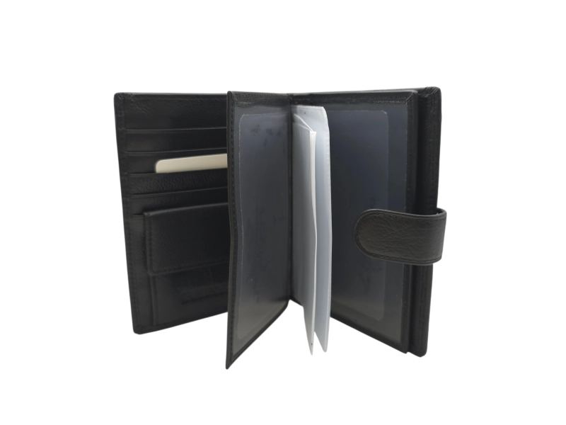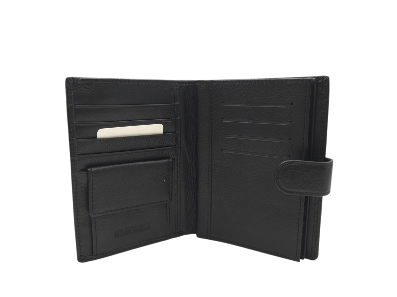 Вертикален портфейл със закопчалка - Черен мъжки портфейл от естествена кожа. - Отделение за банкноти. - Слотове за карти и лични документи. - Отделение за монети с копче тик-так.