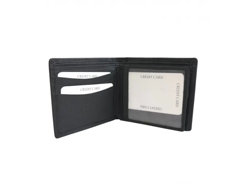 Кожен портфейл с удобно разпределение - Черен мъжки портфейл от естествена кожа. - Отделение за банкноти. - Слотове за карти и лични документи. - Отделение за монети.