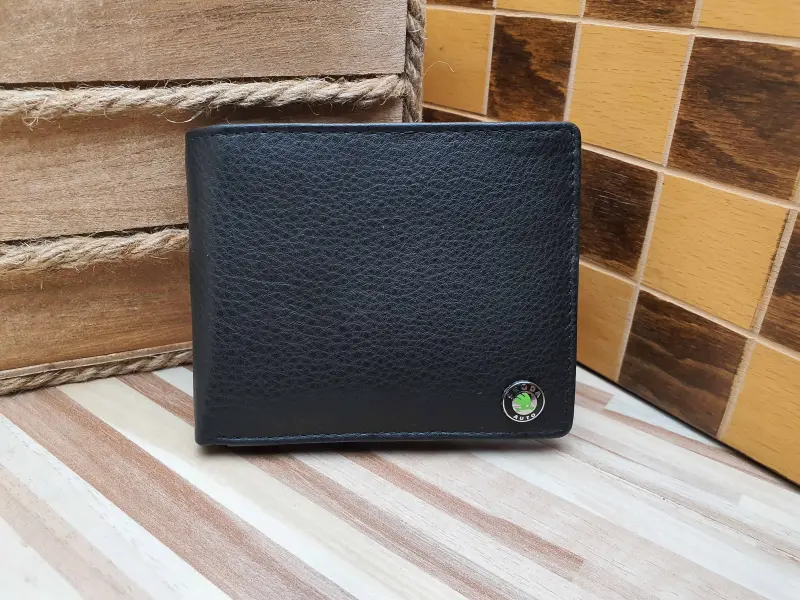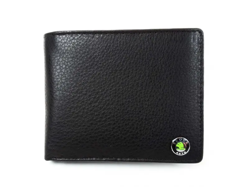 Мъжки кожен портфейл от мека на допир естествена кожа с логото на Шкода. Черен портфейл с удобно разпределение за документи, карти, визитки, монети и банкноти.