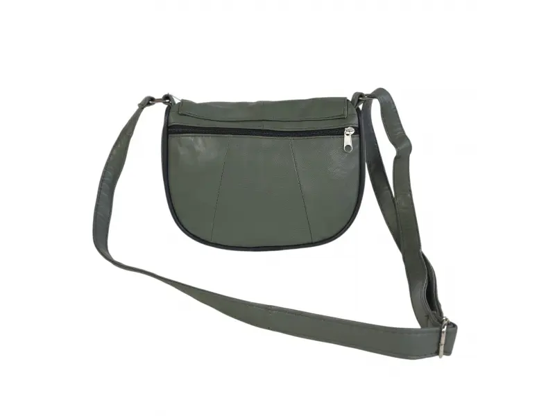 Малка дамска чанта за през рамо - Дамска чанта от естествена кожа. - Едно основно отделение с цип и капак с магнитно закопчаване. - Малко вътрешно джобче с цип. - Преден джоб под капака с цип. - Заден джоб с цип. - Регулираща се се дълга дръжка.