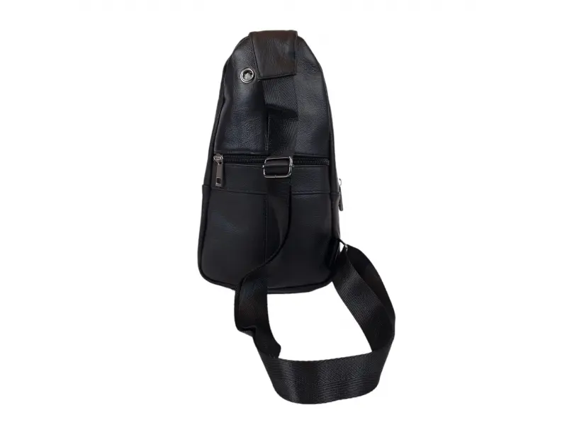 Удобна мъжка чанта Мъжка чанта за през гърди от естествена кожа. Черна мъжка чанта, която може да се носи през гърди, рамо или гръб тип раница. Мъжка чанта с едно основно отделение с цип, малко вътрешно джобче без цип, два предни джоба с цип заден джоб с цип, удобна регулираща се презрамка.