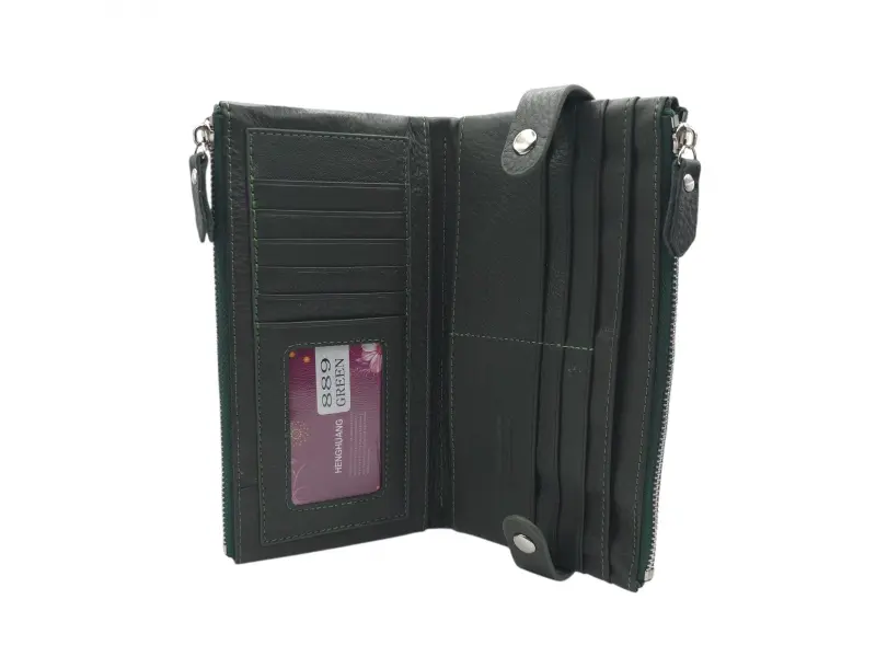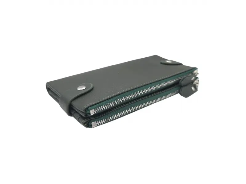 Маслено зелено дамско портмоне с два ципа - Дамско портмоне от естествена кожа. - Закопчаване с копчета тик-так. - Отделения за карти. - Отделения за банкноти. - Два джоба с цип.