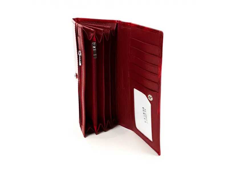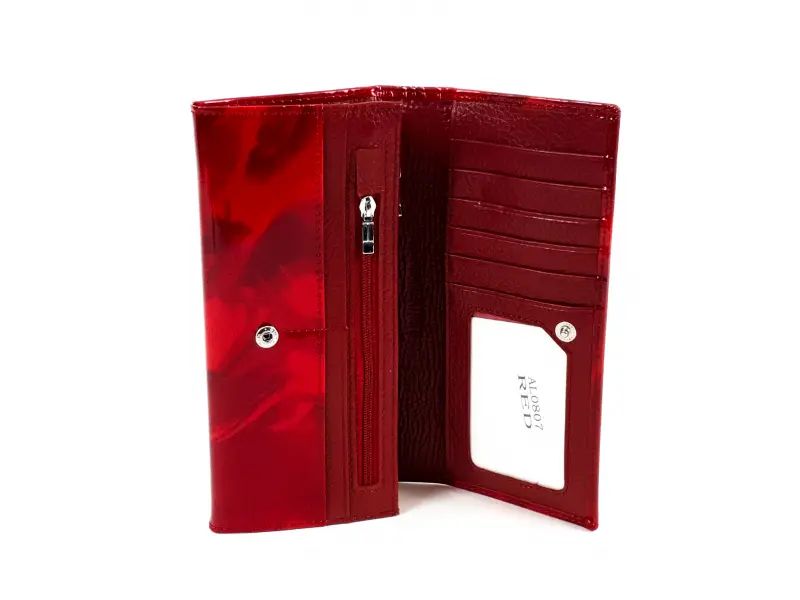 Красиво дамско портмоне от естествена кожа и лак. Червено дамско портмоне с удобно вътрешно разпределение, слотове за карти, място за документи, две вътрешни отделения с цип, кожени прегради за банкноти.