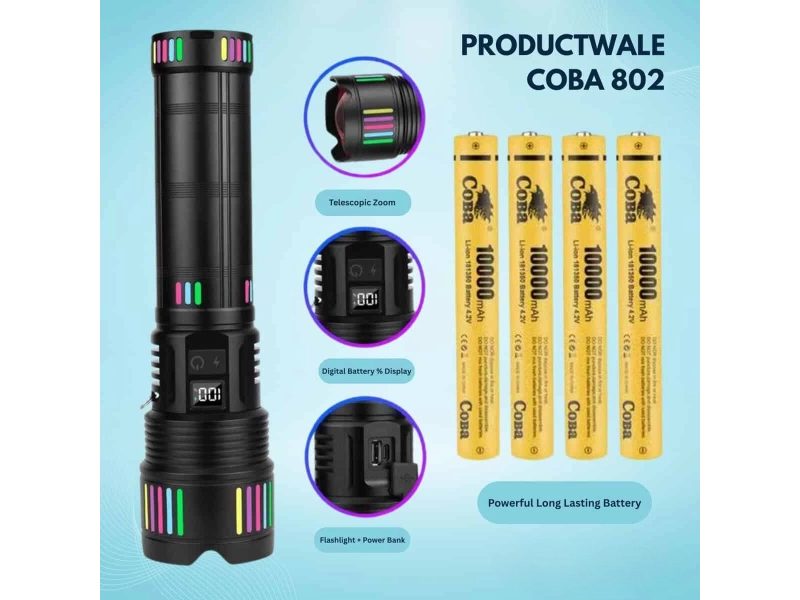 COBA CB-802 е мощен професионален фенер с екстремен обхват , създаден за ситуации, в които обикновените фенери не са достатъчни. Подходящ е за лов, къмпинг, охрана, преходи, аварийни ситуации и работа на открито , като предлага силен и концентриран лъч, прибиращ се zoom и огромен капацитет на батерията.