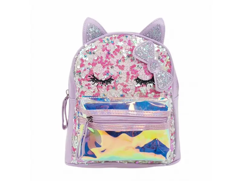 Качествена детска раница в лилав цвят с пайети. Детска раница с едно голямо отделение затварящо се с цип, малко вътрешно джобче и преден джоб с цип. Раница с регулиращи се презрамки и дръжка за носене.