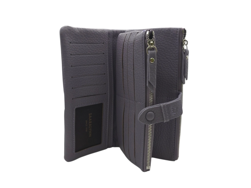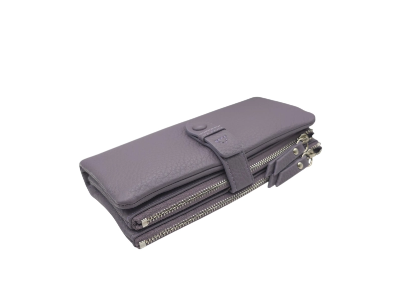 Дамско портмоне в нежен лилав цвят - Дамско портмоне от еко кожа. - Закопчаване с копче тик-так. - Отделения за карти и лични документи. - Отделение за банкноти. - Отделения за монети с цип.
