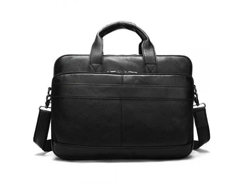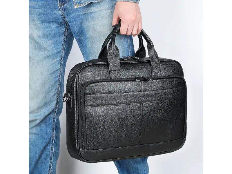 Голяма мъжка чанта от качествена естествена кожа. Луксозна мъжка чанта с отделение за лаптоп с здрави ципове. Черна мъжка чанта с много отделения и удобна дълга регулираща се дръжка.