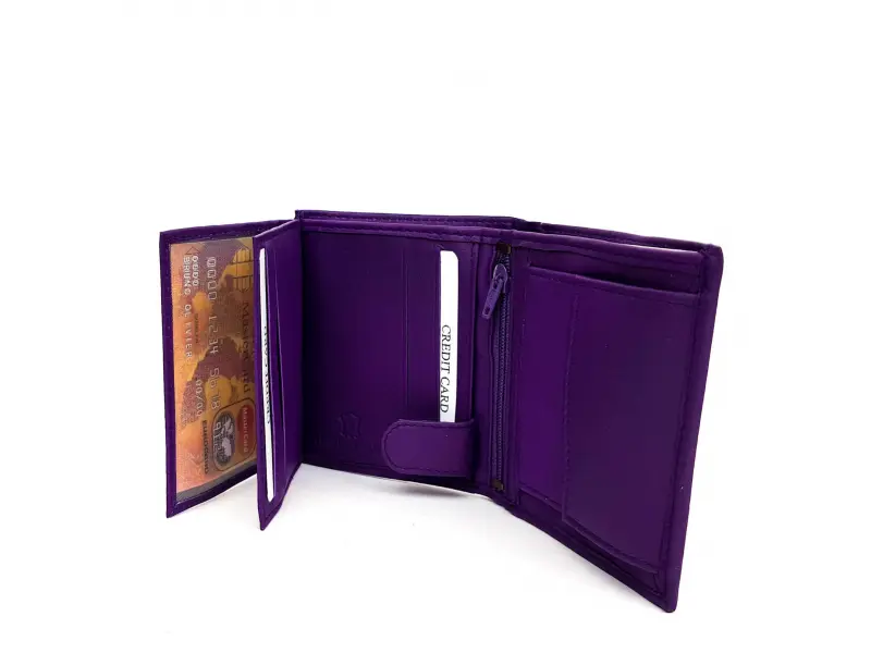 Качествено дамско портмоне в лилав цвят от естествена кожа мека на допир. Удобно разположение за банкноти и монети , слотове за карти и място за документи. Дамско портмоне в наситено лилаво.