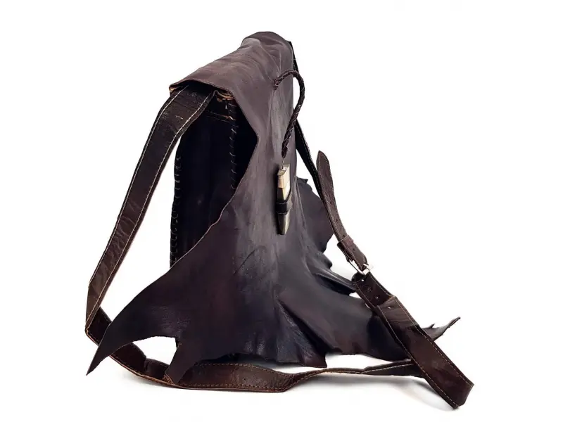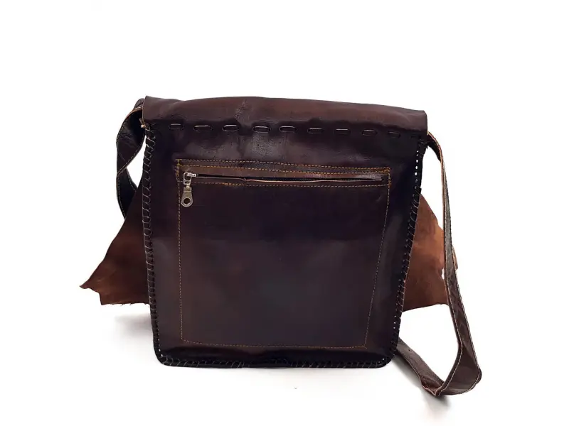 Дамска чанта от естествена кожа , ръчна изработка произведена в Мароко. Страхотен модел с листо , затварящ се с зъб , интересна дамска чанта за през рамо с едно голямо отделение и заден джоб затварящ се с цип , регулираща се дълга дръжка от кожа. Страхотна чанта за ценители.
