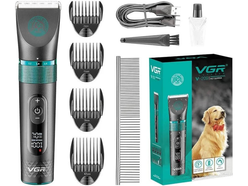Първокласна машинка за подстригване на домашни любимци с усъвършенствана технология и висококачествени компоненти, за да осигури гладко и ефективно подстригване.Професионални остриета: Оборудвана с керамичен нож и титаниева глава, тази машинка за подстригване осигурява прецизно и гладко подстригване, без да уврежда козината на Вашият домашен любимец.Ергономичният дизайн и лекотата я правят лесна за работа, намалявайки умората на ръцете по време на продължителни сесии за подстригване.Спецификации:Цвят: ЧеренБатерия: 2000mAh литиева батерияВреме за зареждане: 3 часаВреме на работа: 200 минутиЗахранване: 5V –1AМаксимални обороти в минута: 7000rpmКакво е включено:VGR V-209 машинка4бр. приставки (3 / 6 / 9 / 12 мм)ГребенМасло за смазванеЧетка за почистванеUSB кабел за зареждане