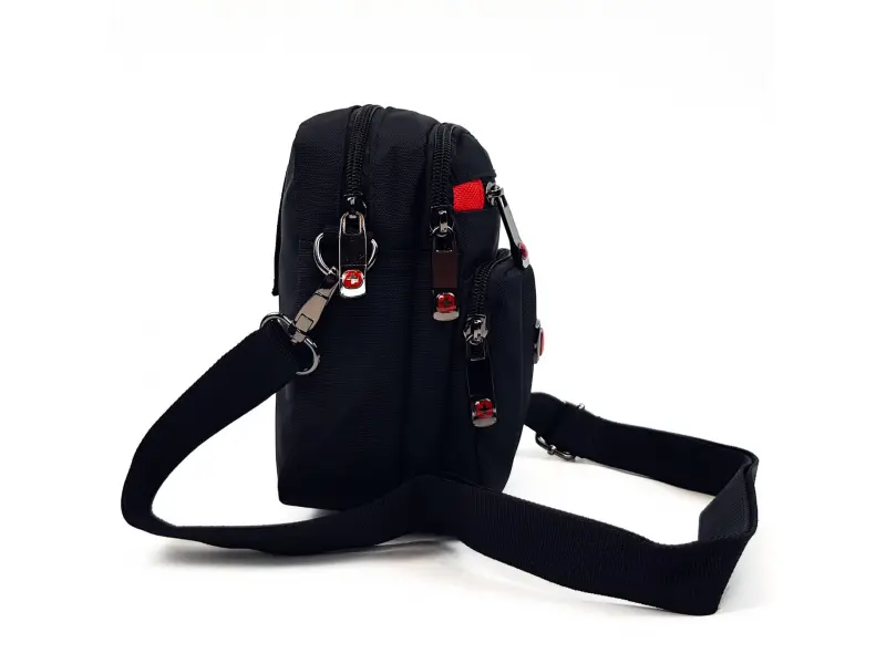 Малка мъжка чанта от високо качество материя. Много здрава чанта с качествени ципове и удобно разпределение на отделенията , има вариант за поставяне на колан. Мъжка чанта в черно - червен цвят.