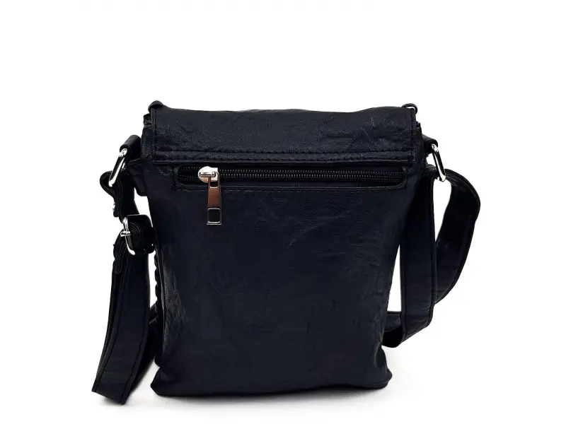Стилна мъжка чанта с ефект на намачканост от еко кожа с цял капак , лесно затварящ се . Дълга дръжка от еко кожа , чанта с две прегради в голямото отделение и джобче затварящо се с цип отзад.