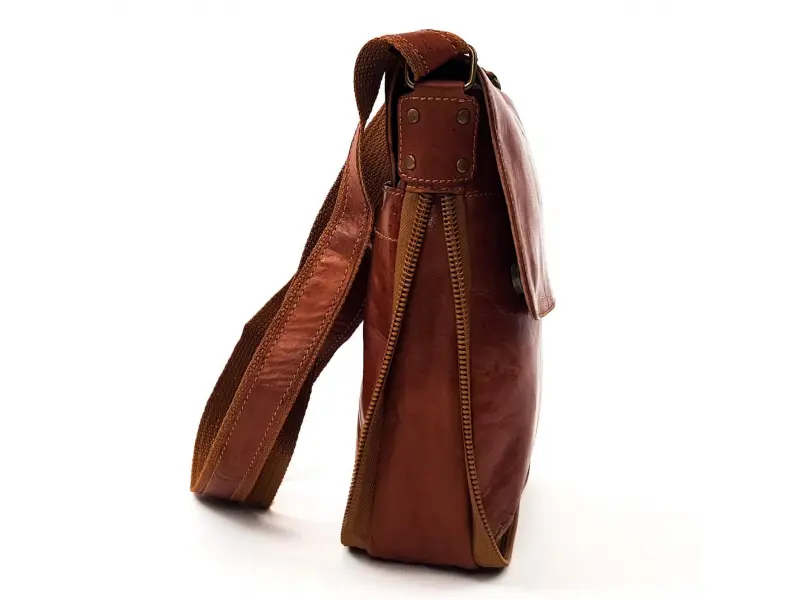 Качествена мъжка чанта произведена в Мароко от естествена , натурална кожа в червеникаво - кафяв цвят. Мъжка чанта с дълга дръжка и капак , цип през цялата чанта с който може да се увеличи обема на чантата.
