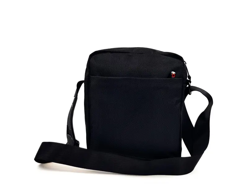 Много здрава мъжка чанта от качествена материя и удобни отделения. Мъжка чанта за през рамо в черен цвят с кръст по средата и регулираща се дръжка от полиестер.