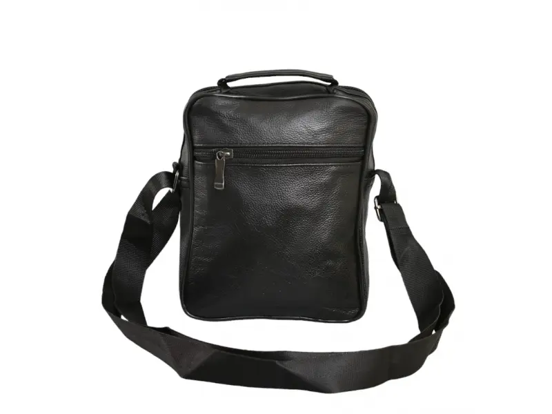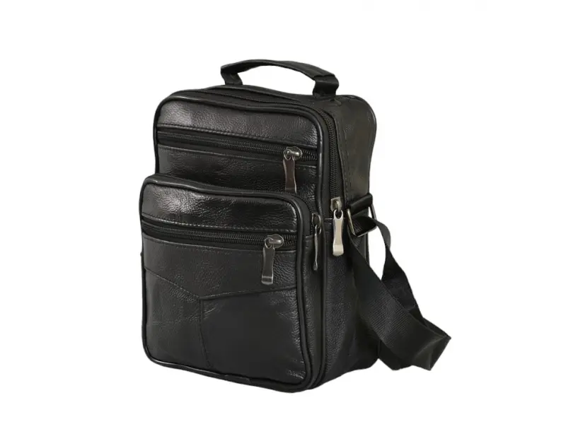 Мъжка чанта от естествена кожа на промоция - Едно основно отделение с цип. - Три предни джоба с цип. - Заден джоб с цип. - Регулираща се презрамка. - Дръжка за носене в ръка.