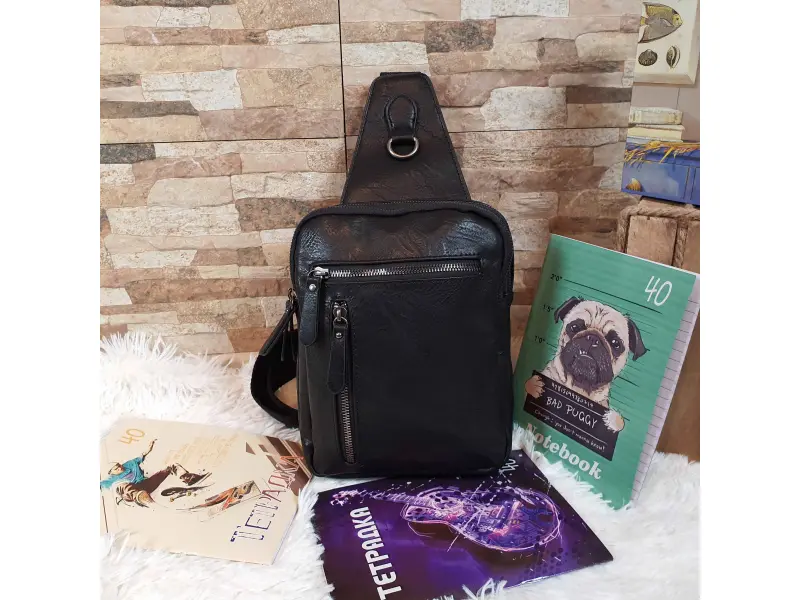 Мъжка чанта за през гърди от качествена изкуствена кожа. Черна мъжка чанта която може да се носи през гърди, рамо или гръб тип раница. Мъжка чанта с две големи отделения и две предни джобчета, затварящи се с ефектен сребрист цип.