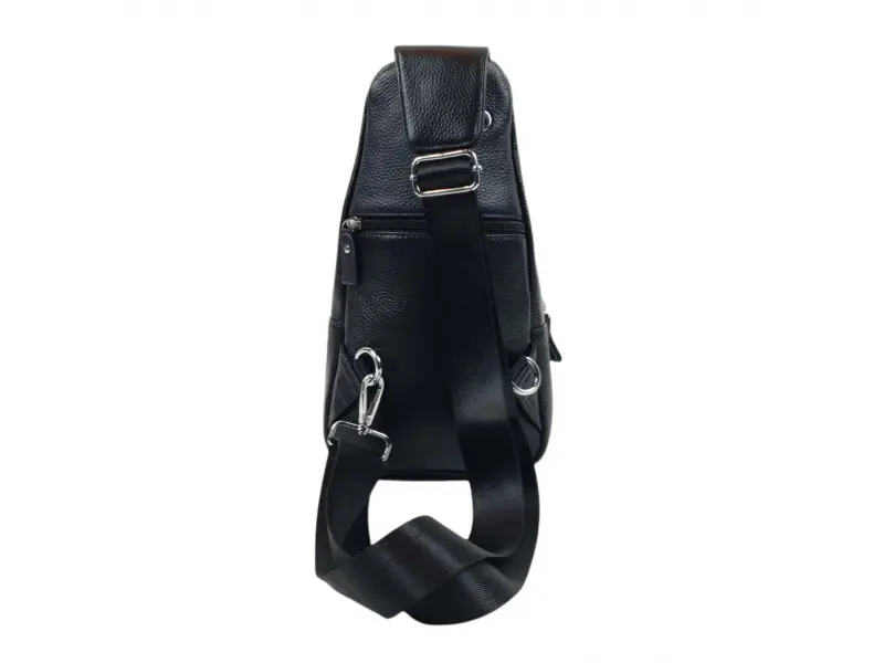 Мъжка чанта за през гърди от естествена кожа. Черна мъжка чанта, която може да се носи през гърди, рамо или гръб тип раница. Мъжка чанта с едно основно отделение с цип, малко вътрешно джобче с цип, отделение за телефон или документи, преден и заден джоб с цип, удобна регулираща се презрамка.