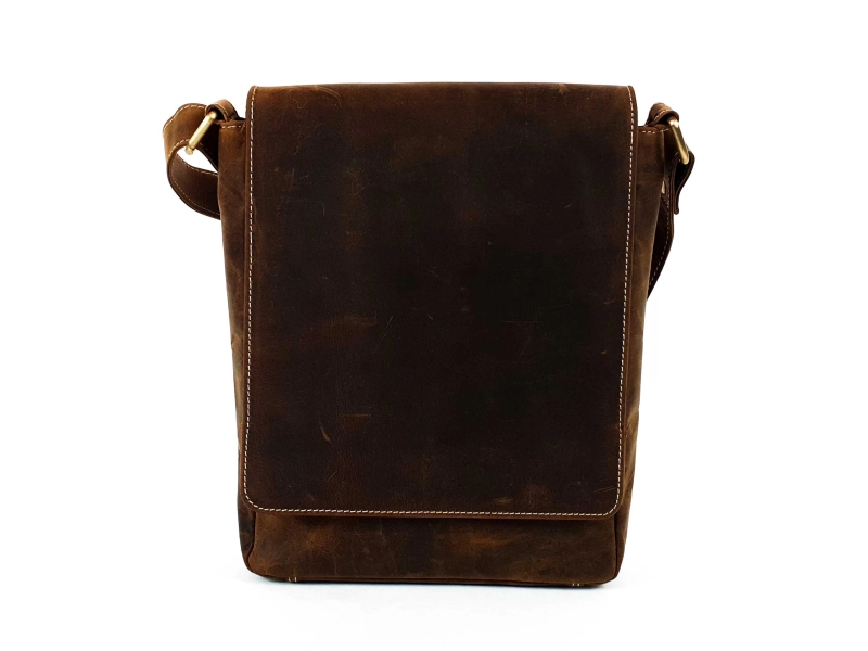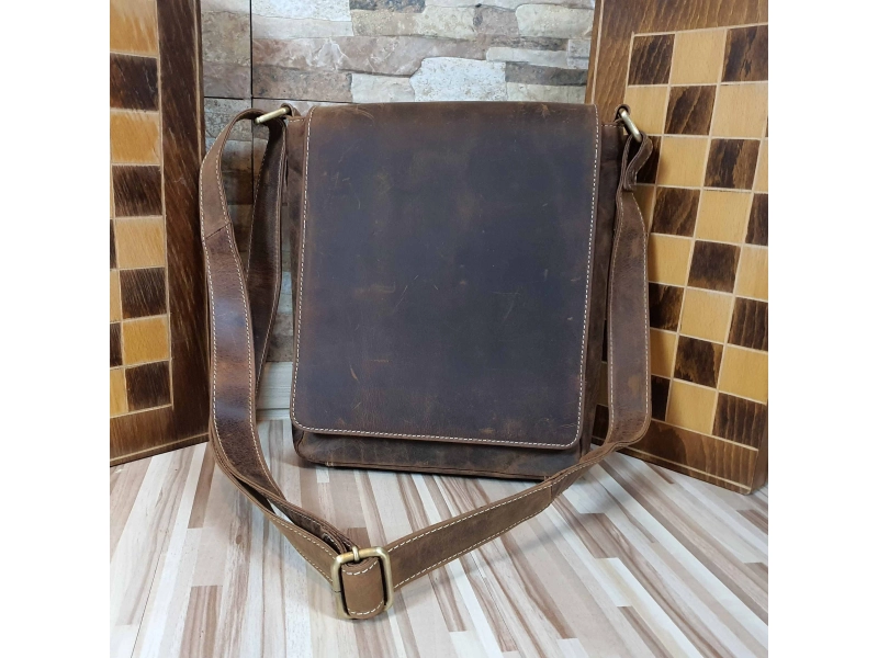 Качествена мъжка чанта от естествена телешка кожа със специална обработка - Hunter. Голяма кафява мъжка чанта с капак и магнитно закопчаване, едно основно отделение с цип, вътрешно малко джобче с цип, място за телефон, предно отделения и заден джоб с цип, регулираща се кожен дръжки.