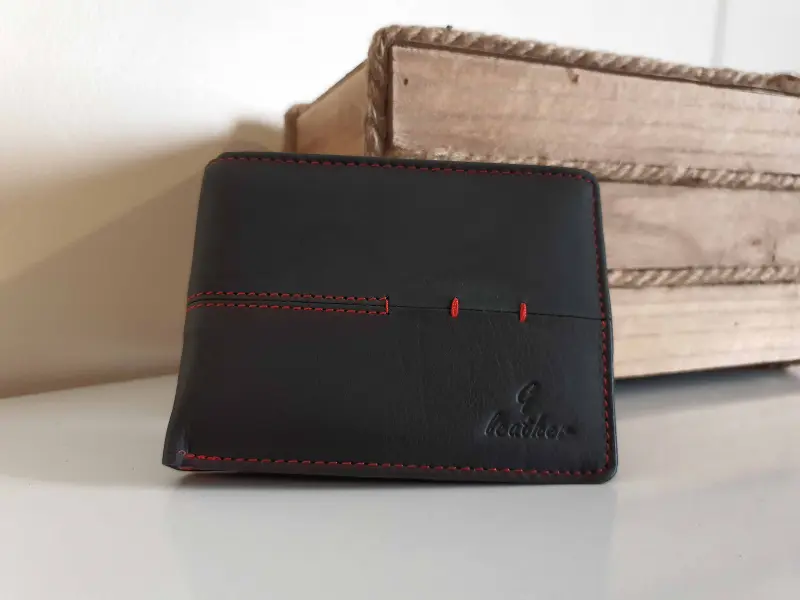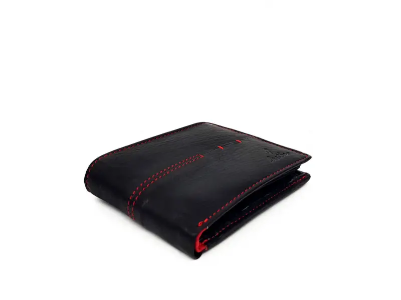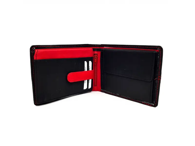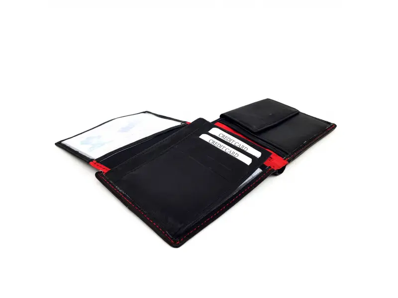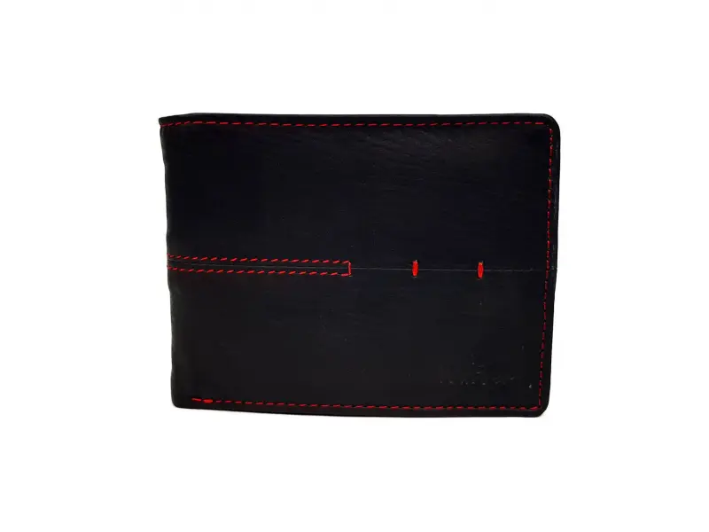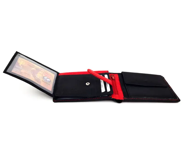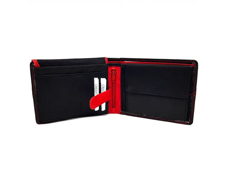 Качествен мъжки портфейл в черно с червен конец. Удобно портмоне с много място за документи , банкови и визитни карти.
