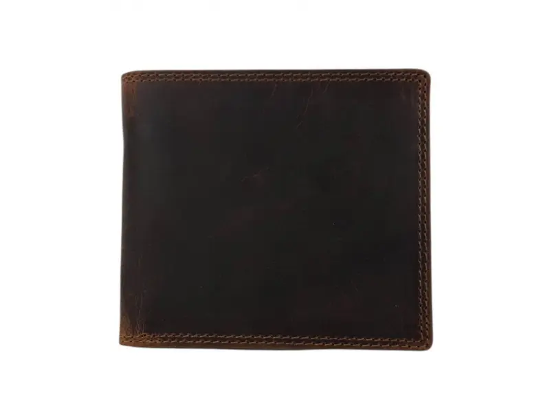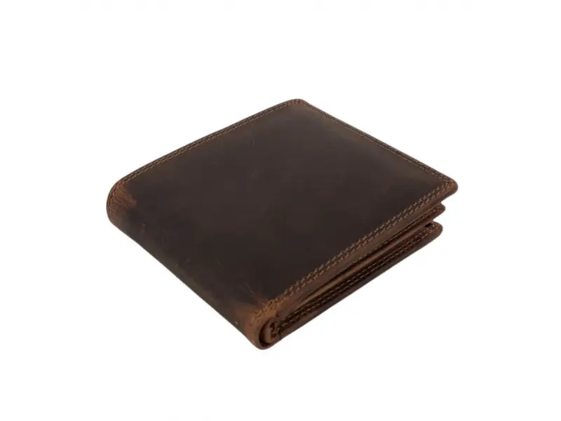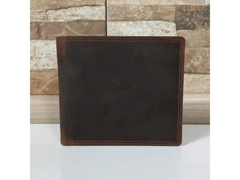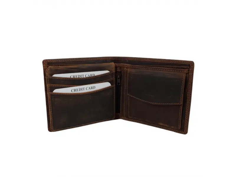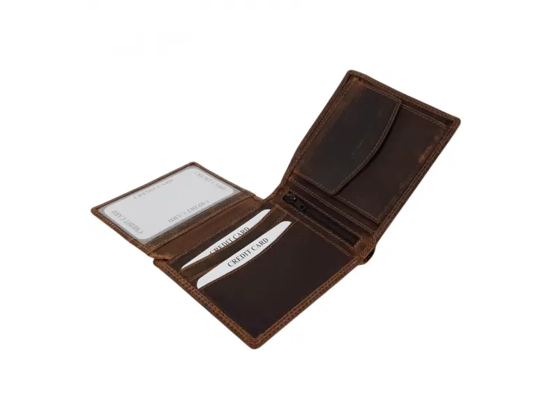 Удобен мъжки портфейл от специално обратотена hunter естествена кожа. Кафяв портфейл с вътрешно отделение за монети, слотове за карти и преграда за банкноти.