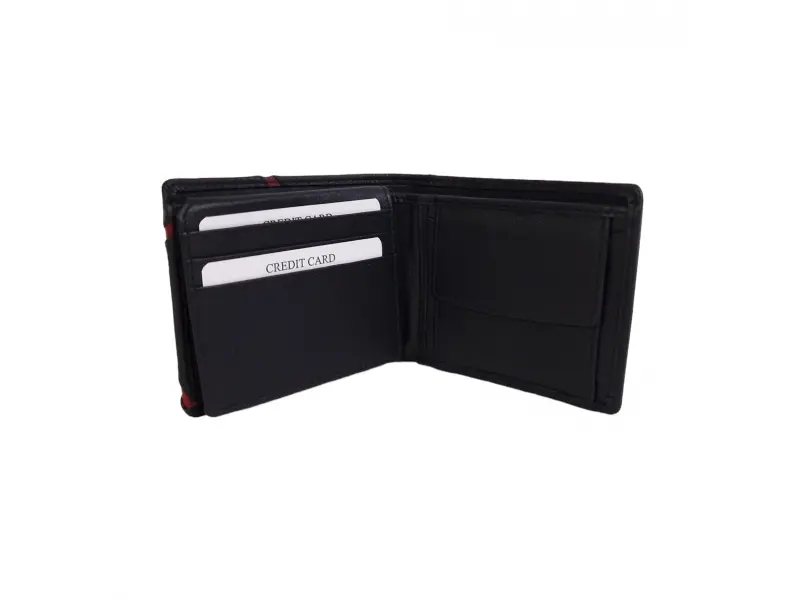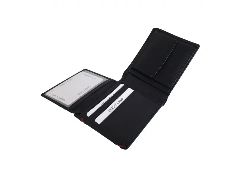 Кожен мъжки портфейл с червено - Мъжки портфейл от телешка, естествена кожа. - Отделенение за банкноти с преграда. - Слотове за карти и лични документи. - Отделение за монети закопчаващо се с копче.