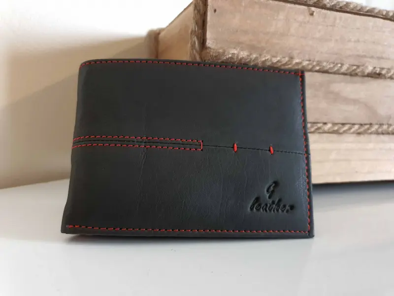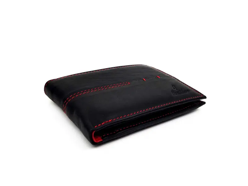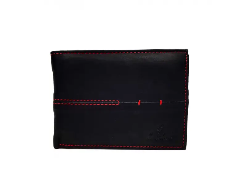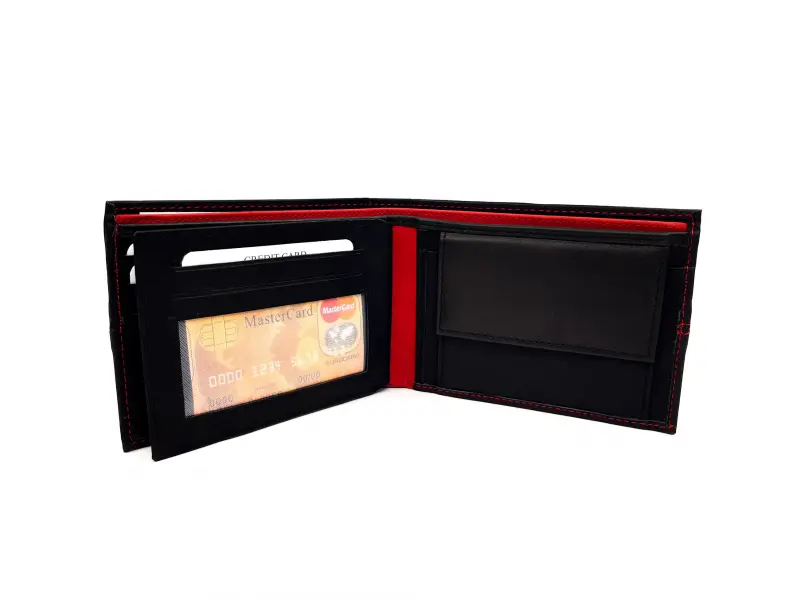 Мъжко портмоне от естествена мека кожа в черен цвят с червено . Портмоне с отделения за карти , визитник и монетник.