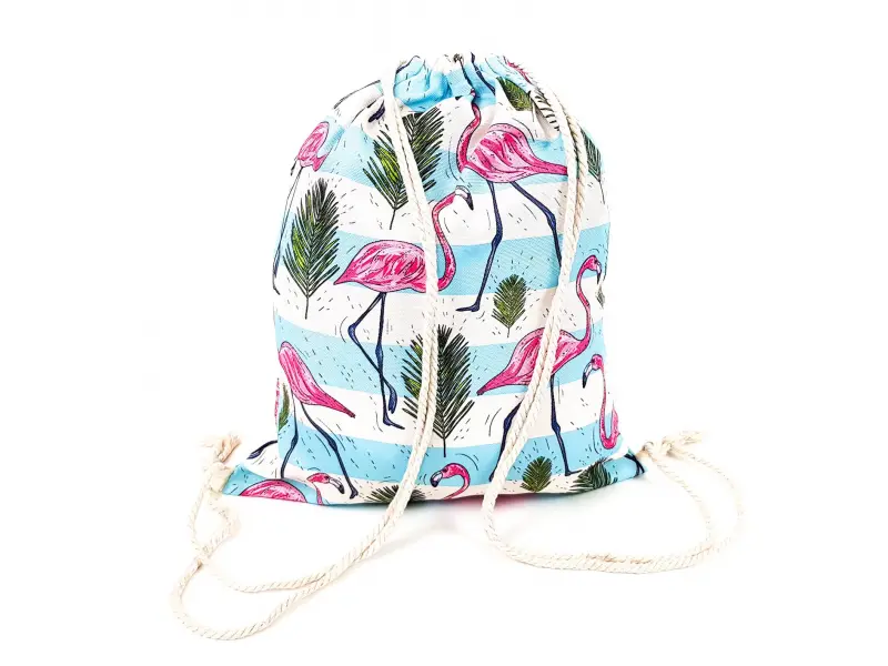 Свежа мешка с бяло - сини райета , фламингота и листа. Раница тип мешка с едно отделение , пристягаща се с въжени връзки. Мешка подходяща за момиче , за ежедневието или за плаж.