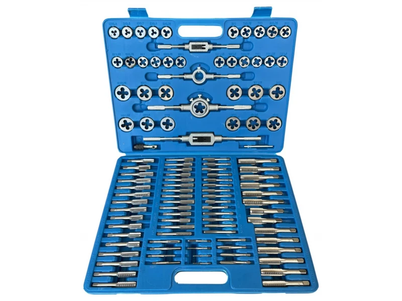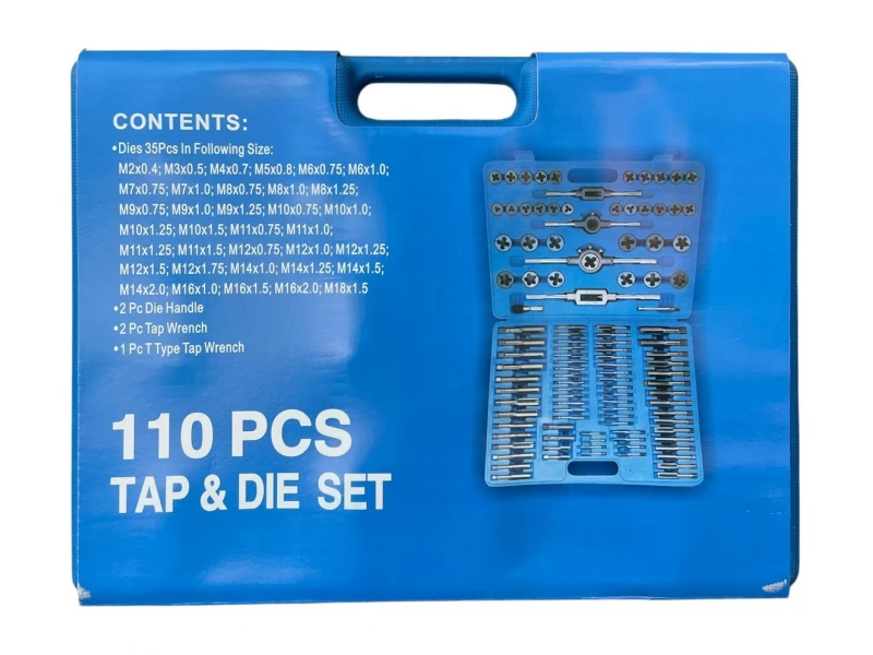 Професионален комплект KraftRoyal 110 части метчици и плашки от въглеродна стомана, с резби M2–M18 и куфар за съхранение – перфектен за механици и “направи си сам”.