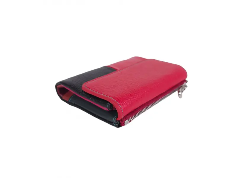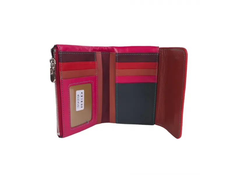Купи сега многоцветно дамско портмоне от естествена кожа на ниска цена. Средно дамско портмоне с магнитно закочаване, отделения за банкноти, карти и лични документи и монетник.