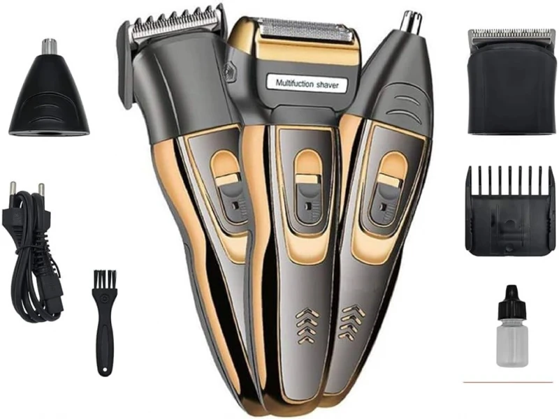Всеки мъж, който държи на своя перфектен външен вид, би бил щастлив да открие този нов модел мултифункционален тример 3 в 1, който притежава всичко необходимо за перфектната визия и имидж. Тримерът има три сменяеми глави, едната осигурява гладко бръснене, втората подстригване на косата а третата почистване на носа и ушите от косми. Главата за бръснене използва прецизно стоманено острие с титаниево покритие и позволява плавно движение на главата по начин, който следва извивките на лицето, кожата става гладка без опасност от наранявания. Главата за подстригване може да оформя косата на различна дължина, според нуждите и предпочитанията. Главата за почистване на космите от ушите и носа, позволява да се поддържа перфектен вид, всеки ден. Уредът има новаторски дизайн в златисто и черно, който акцентира на неговия висок клас.