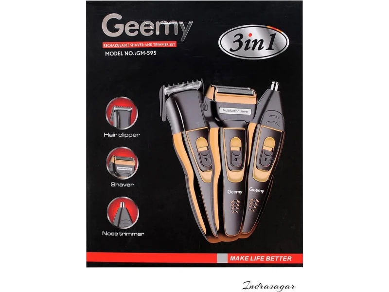 Всеки мъж, който държи на своя перфектен външен вид, би бил щастлив да открие този нов модел мултифункционален тример 3 в 1, който притежава всичко необходимо за перфектната визия и имидж. Тримерът има три сменяеми глави, едната осигурява гладко бръснене, втората подстригване на косата а третата почистване на носа и ушите от косми. Главата за бръснене използва прецизно стоманено острие с титаниево покритие и позволява плавно движение на главата по начин, който следва извивките на лицето, кожата става гладка без опасност от наранявания. Главата за подстригване може да оформя косата на различна дължина, според нуждите и предпочитанията. Главата за почистване на космите от ушите и носа, позволява да се поддържа перфектен вид, всеки ден. Уредът има новаторски дизайн в златисто и черно, който акцентира на неговия висок клас. Мултифункционалните уреди са много практични, удобни, те позволяват да ги използвате по време на пътуване, те са чудесен подарък за човек на който държите. Използването на този уред с 3 глави осигурява пълна функционалност и спестява нуждата от закупуване на отделни уреди за всяка необходимост. Този нов модел с изключителен дизайн съчетава в себе си всички функционалности, които са необходими на един мъж да поддържа своя външен вид, като главите и приставките са с най – високо качество, остриетата са изработени от неръждаема стомана и имат титаниево покритие. Високо качество, което ви гарантира дълга и безпроблемна експлоатация. Заредете тримера докато индикаторът покаже, че батерията е с пълна мощност. Поставете главата, която ще използвате в зависимост от функцията, която искате да използвате. Включете тримера от бутона и го приложете върху зоните, които ще подстригвате, бръснете или почиствате. След употреба почистете главата с четката, която е приложена в комплекта. ХАРАКТЕРИСТИКИ:Мултифункционален тример 3 в 1;Модел: GM-595;Номинални волтове: AC220-240V 50-60Hz;Мощност: 3W;Материал на острието: неръждаема стомана с покритие от титан;Корпус: ABS;Цвят: Златисто и черен;Захранване: Високоефективна зареждаща батерия;Време за зареждане: 8 часа пълно зареждане.КОМПЛЕКТЪТ ВКЛЮЧВА:1 бр. Тример със сменяема глава;1 бр. Глава за подстригване;1 бр. Глава за нос и уши;1 бр. Приставка тип гребен;1 бр. Четка за почистване;1 бр. Бутилка с масло;1 бр. USB кабел;1 бр. Защитна капачка;1 бр. Батерия;