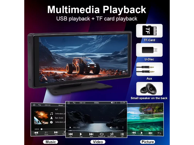 🌟 Основни предимства на мултимедията CarPlay H105V 10.26″📺 Голям и ясен IPS дисплей 10.26″ IPS екран с висока резолюция (V851 VGA) за отлична видимост и ярки цветове 😊 Широка диагонал за лесно управление и безопасно използване по време на шофиране 📱 Безжично CarPlay и Android Auto Интегрирано безжично Apple CarPlay и Android Auto за огледално свързване на вашия iOS или Android смартфон Гласово управление и навигация директно през екрана 🎶 Мултифункционален MP5 плейър и Bluetooth Вграден MP5 плейър за MP5 видео, музика и GPS навигация чрез смартфон Bluetooth за безжични телефонни разговори и стрийминг на музика AUX вход (3.5 mm) за връзка със заводската аудио система 🔌 Лесно захранване и монтаж Захранване през запалка (5 V/3 A) с включен 3 m кабел Настолна стойка за монтаж без разглобяване на таблото Опционална VGA камера за заден ход (купува се отделно) 📋 Технически характеристики Модел: H105V Тип устройство: Автомобилен MP5 мултимедиен плейър Екран: 10.26″ IPS дисплей Резолюция: V851 VGA (висока яснота) CarPlay: Безжичен Apple CarPlay Android Auto: Безжичен Android Auto Bluetooth: Да - телефонни разговори и музика Захранване: 5 V / 3 A (3 m кабел за запалка) Монтаж: Настолна стойка, без разглобяване на таблото AUX вход: 3.5 mm Камера за заден ход: Опционална VGA камера Оперативна система: Без вградена ОС - огледално свързване към смартфон Съвместимост: iOS и Android устройства с поддръжка на CarPlay/Android Auto 📦 Комплектът включва Мултимедия CarPlay H105V 3 m захранващ кабел за запалка (5 V / 3 A) Настолна стойка за монтаж AUX кабел (3.5 mm) Ръководство за употреба
