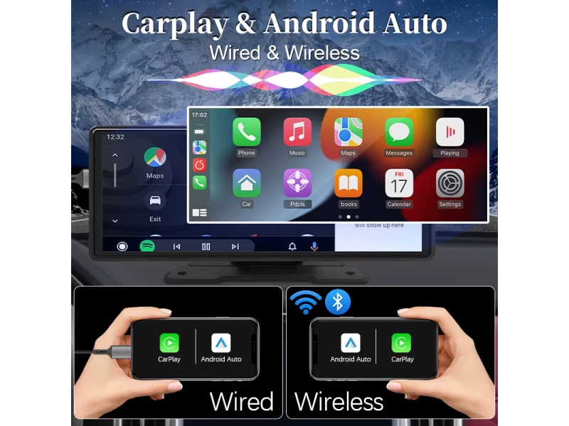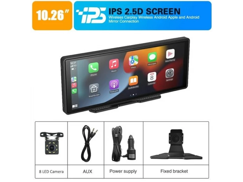 CarPlay H105V 10.26″ мултимедия с IPS дисплей, безжичен Apple CarPlay и Android Auto, MP5 плейър, Bluetooth, AUX, 5 V/3 A захранване и лесен монтаж без разглобяване на таблото.
