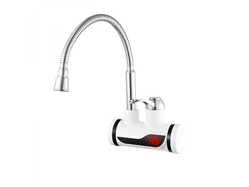 Компактен проточен нагревател за стенен монтаж с гъвкав чучур, дисплей за температура и двойна защита. Моментално затопляне, икономия на вода и енергия.
