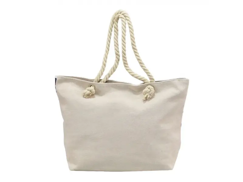 Плажна чанта с риля и кораб Голяма плажна чанта от текстил. Едно основно отделение с цип. Вътрешно джобче с цип. Дръжки тип - въже. Щампа с морски мотиви.