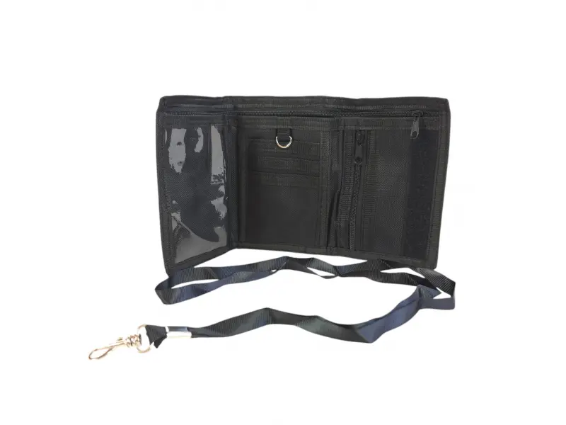 Камуфлажен портфейл с лепенка - Мъжки портфейл от плат. - Отделенение за банкноти. - Отделение с цип. - Слотове за карти и лични документи. - Монетник с цип. - Връзка за носене.